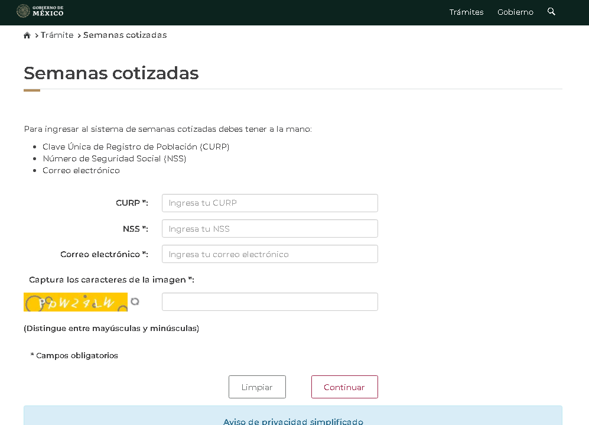 Teniendo estos datos se procede a ingresar al portal destinado para tal fin por el IMSS https://serviciosdigitales.imss.gob.mx/semanascotizadas-web/usuarios/IngresoAsegurado
